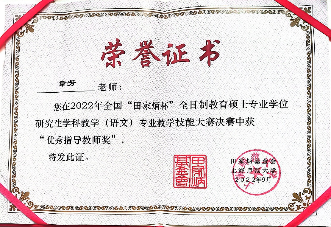 此赛有来自全国近200所高校的学科教学硕士研究生,共计455名选手参加。比赛过程历时长达四个多月,历经竞争激烈的初赛,由公司研究生教师技能团队指导的2020级学科教学(语文)专业研究生黄静雨以优异的成绩入围决赛,并取得优异成绩。同时,公司章芳和杨名2位指导老师荣获“优秀指导教师奖”。