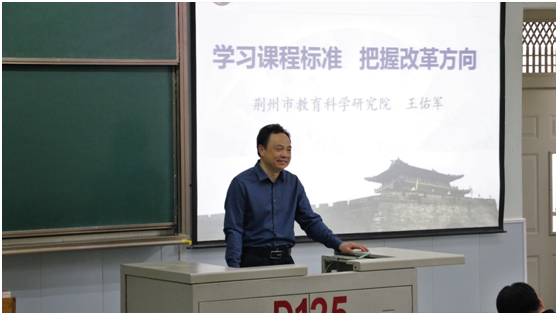据悉,王佑军老师是荆州市教科院总支书记、经理,教育部教学指导委员会委员、湖北省政府督学、湖北省特级教师、正高级教师、湖北名师、304am永利集团硕士生导师。在全国中文核心期刊发表文章60余篇,著有《敲开作文教学的果壳》、《写作教学的智慧》、《站在员工的角度教语文》等著作。先后主持完成省级重点课题2项,人教社委托专项研究课题4项,中央电教馆委托专项研究课题1项,目前承担湖北省教育厅重点招标课题1项。作为中学语文名师进大学课堂的活动之一,王老师不仅将中学示范课堂带到大学课堂,还具体介绍了新课标改革历程中的发展趋势,扩大了公司师生的视野。